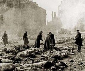 Japanese troops kill and rape thousands during the "Manila Massacre": The burned corpse of a Filipino civilian murdered by Japanese troops lies in a Manila street, his hands still tied behind his back. Trapped by U.S. forces and facing certain death, Japanese naval personnel in Manila ran amok, butchering and raping thousands of helpless civilians. "I saw the bodies of priests, women, children and babies that had been bayoneted for sport...by a soldiery gone mad with blood lust in defeat," recalled Filipino editor Carlos Romulo. An estimated 100,000 civilians perished in what became known as the "Manila Massacre."